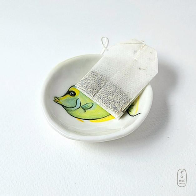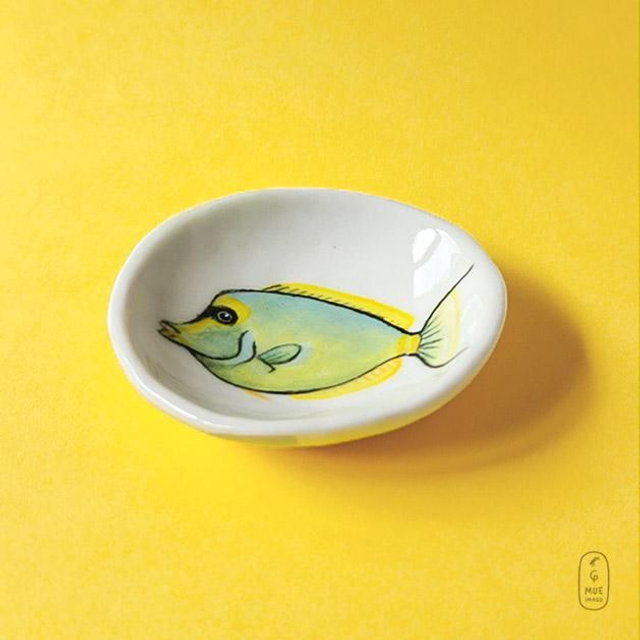 Le dessin du poisson est réalisé à la main avec des engobes puis émaillé avec une couverte transparente.
